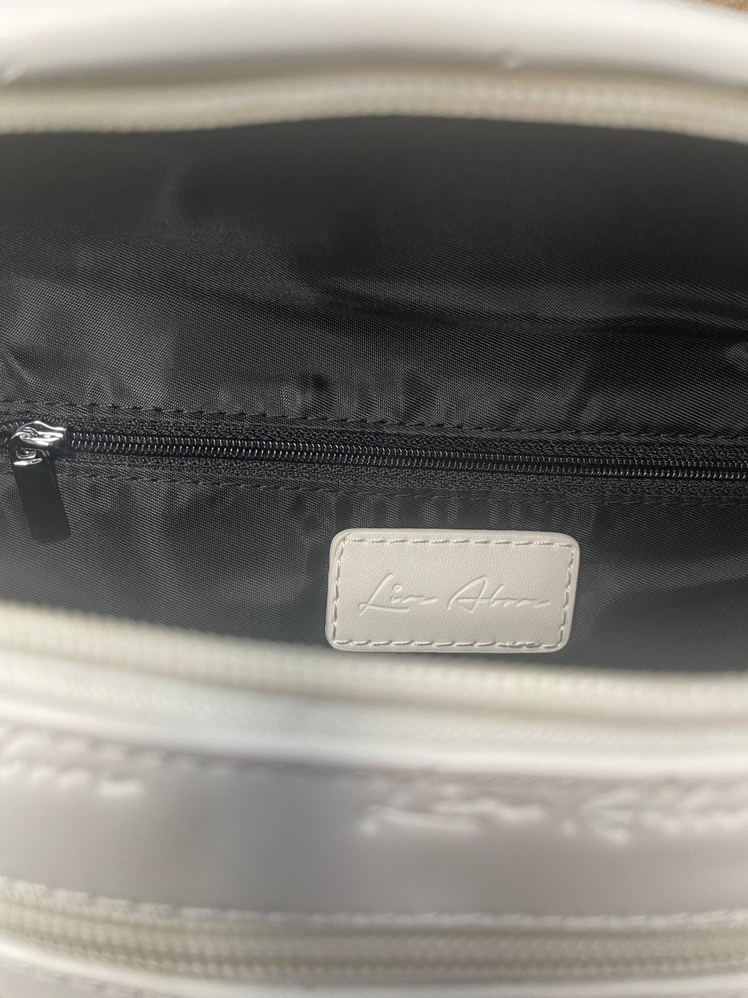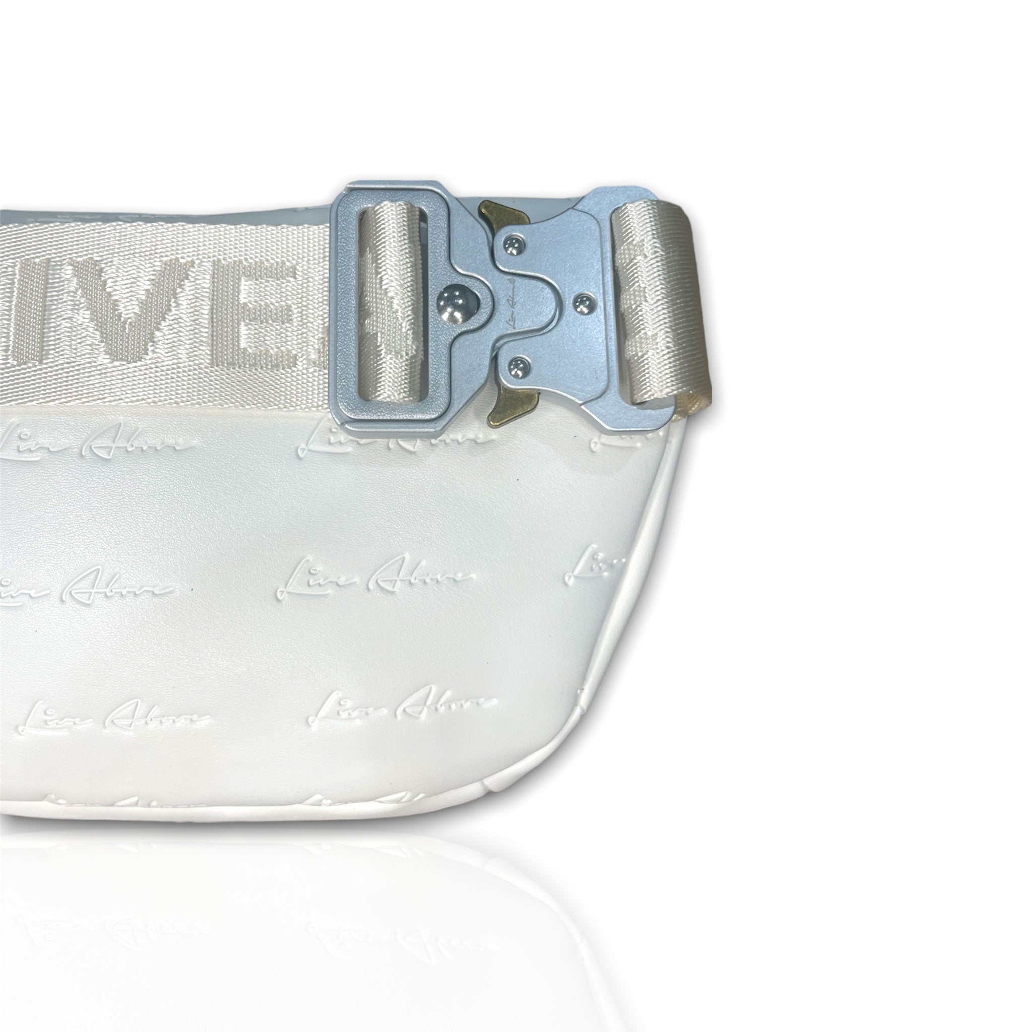 New this season comes our LA crossbody bag in Bone. Crafted in premium white vegan leather with our signature ‘Live Above’ logo embossed throughout. This bag features our well designed steel buckle for a secure fit, made to adjust for any size. The LA crossbody bag is perfect for travel and daily activities to keep your personal items protected. The adjustable Live Above knitted strap allows for the bag to be worn as a crossbody, over the shoulder or as a waist bag. The style is limitless